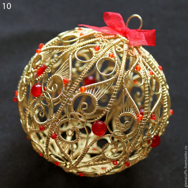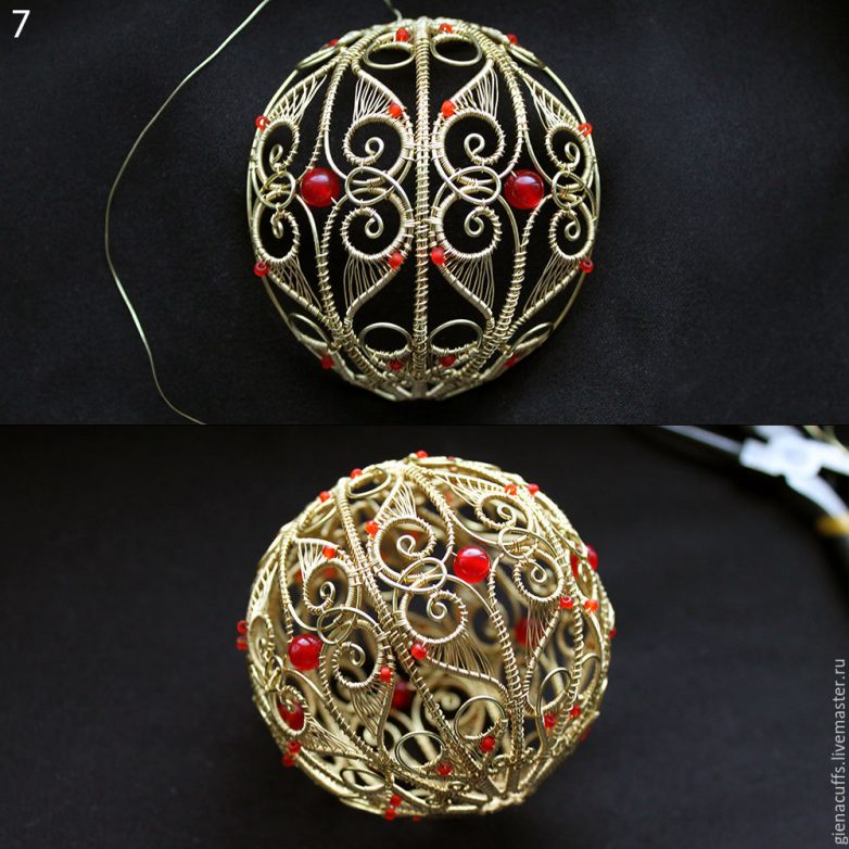 9) Загибаем концы усиков от нашего крепления полукругом и приплетаем с помощью тонкой проволоки их к шарику.