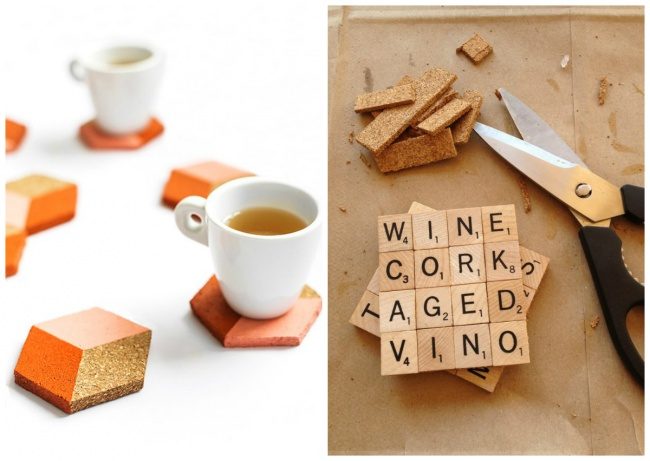 Подставки для кружек — подарок, который точно не будет пылиться на полке. Сделать их можно из обычной пробковой подставки под горячее, надо только грамотно обрезать ее и добавить ярких красок. Или использовать таблички с буквами из настольных игр: придумать слова — и вперед!