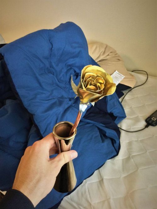 Обладая руками, растущими из нужного места, он сделал для неё «золотую» розу (из медной трубки, тонкой стали и листа латуни) и презентовал в также собственноручно изготовленной коробке. И ничего что она не по-настоящему золотая, зато смотрится красиво и сделана от души!