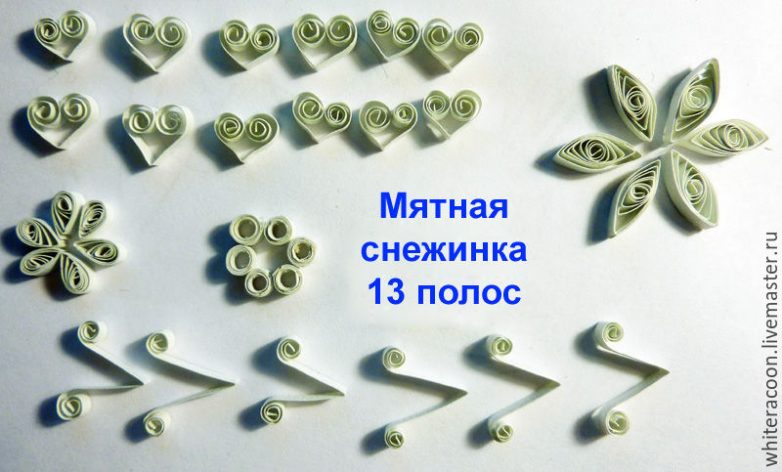 V- образный элемент: 1/4 стандартной полосы, согнуть пополам, концы закрутить по направлению наружу, при этом прекратить скручивание, не доходя 1,5 см до места сгиба (т.е. середины) и вынуть инструмент. «Ложбинку» этой V внутри можно подклеить возле самого низа, она будет более строгой на вид — это нужно лунной снежинке и мятной, а вот мятно-голубой ничего подклеивать не надо как раз).