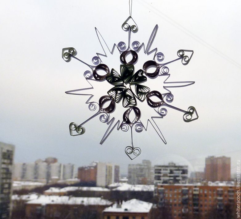 Любуемся. Можно украшать окна, можно вешать на ёлку, можно прикрепить на открытку. При необходимости можно продеть ниточку: