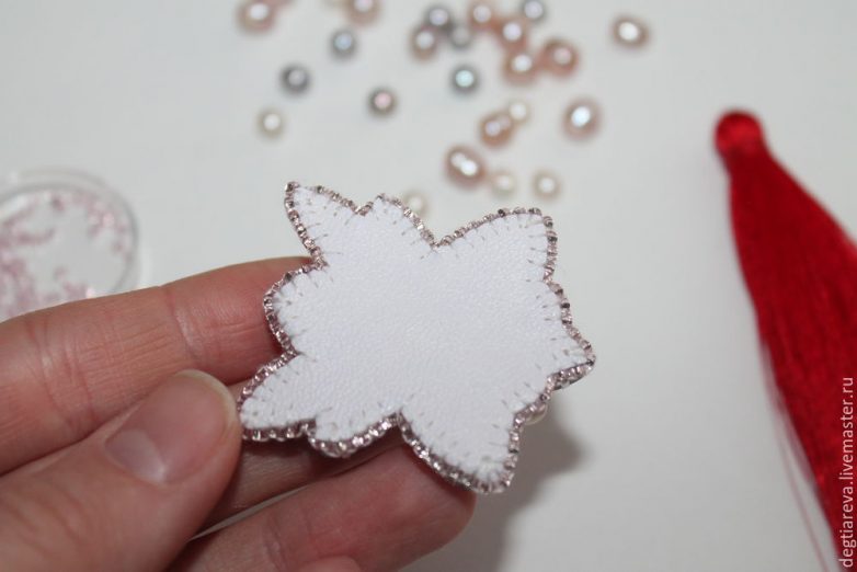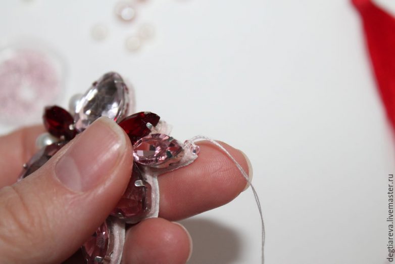 Теперь оформим центральную жемчужину бисером. Делаем стежок, вытягиваем иглу поверх вышивки, набираем 10 бисерин, продеваем иглу между двумя пришитыми стразами, обрамляя жемчужину.