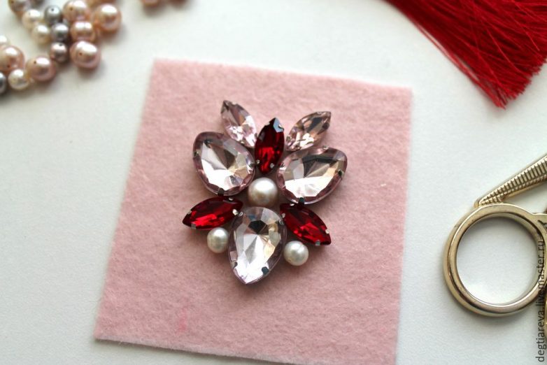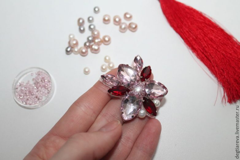 После того как все стразы тщательно пришиты, закрепляем центральную жемчужную бусину в центре цветка.
