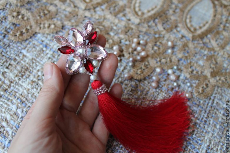 Заключительный этап: оформляем кисть бисером в тон, используя нить крепим кисть к вышивке. В дополнении при креплении элементов я использовала бусину жемчуга. Проходим иглой несколько раз, прячем кончик нити в вышивке.