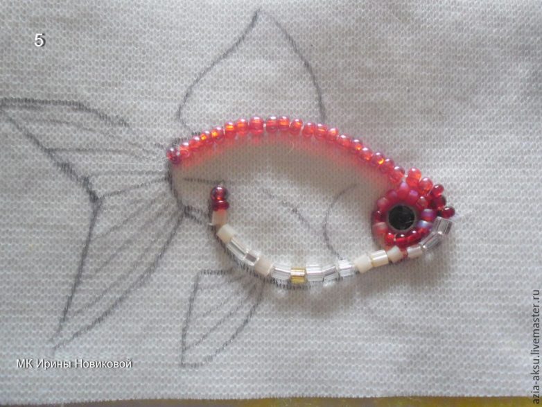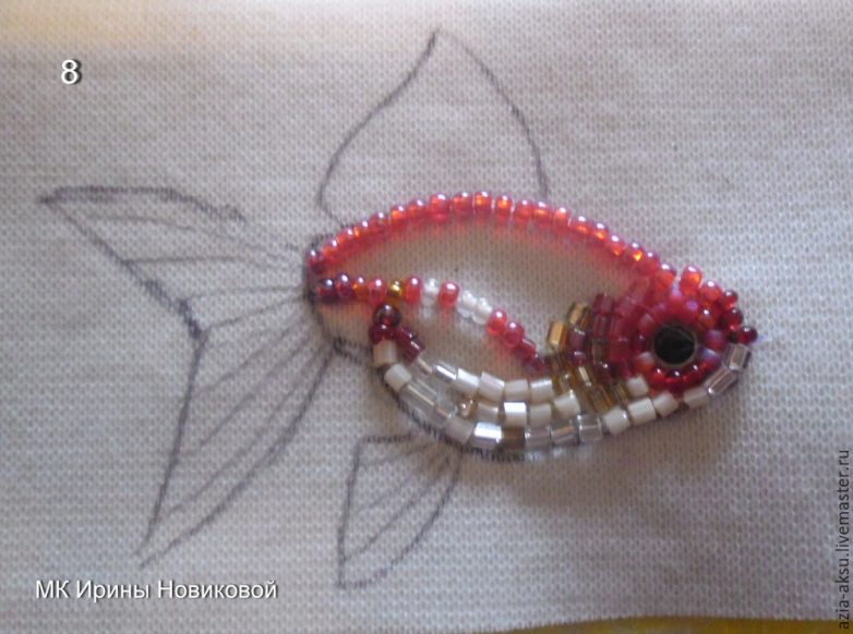 Плавник вышиваю рядами без просветов. Один ряд матовым бисером, второй — прозрачным. Так чередую до конца. Основание плавника делаю цветным в самом начале и белым в конце.
