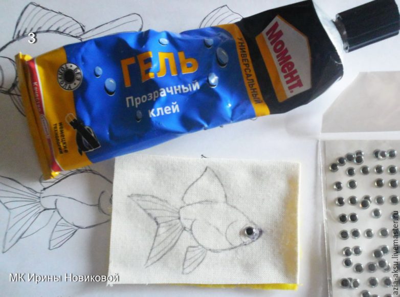 Потом приклеиваю глазик. В кадре видно упаковку глазиков, которыми я пользуюсь. В принципе, их смело можно заменить бусинками, полубусинками, бисеринками или мелкими кабошончиками.