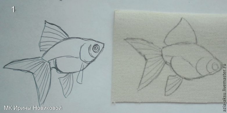 В общем, готовыми эскизами я почти никогда не пользуюсь, так как предпочитаю рисовать сама. Благо, с золотыми рыбками была достаточно хорошо знакома, имея несчастье быть в прошлом их обладательницей. Для тех же, кто имеет о них представление только по иллюстрациям к сказке Пушкина о бабуле с корытом, есть масса фото в сети этих самых золотых рыбок разных пород и окрасов. К сожалению, моих эскизов сохранилось мало, так как и внучка к ним руку приложила… и кошки приложили лапы, когти, зубы и прочие части тела…