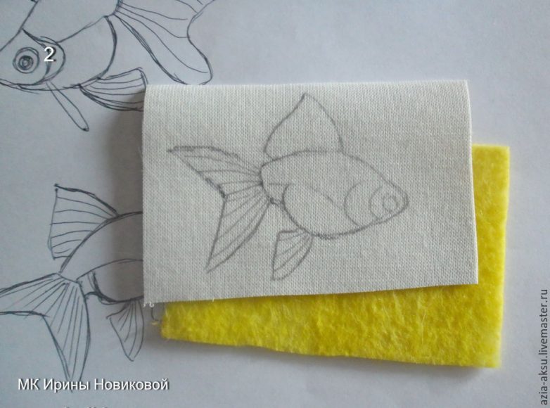 В этот раз, для ускорения процесса, взяла самую малепусенькую, 5 см длиной. Тряпочку желтенькую видели, на которой кусочек кожзама лежит? Тряпочка не просто так в кадре засветилась. Ружжо, которе в первом акте на гвоздике висело, в последнем обязательно должно выстрелить! © Это не просто тряпочка, а заменитель фетра! Фетр тратить мне жаааалко на подклейку к изнанке кожзама. Поэтому я повадилась покупать упаковками тряпочки для мытья посуды. Они разного цвета, по текстуре и плотности — вылитый тонкий фетр! И стоят копейки. Для экономных хозяек вышивальщиц. Вот эту тряпочку и подклеиваю под рыбку свою.