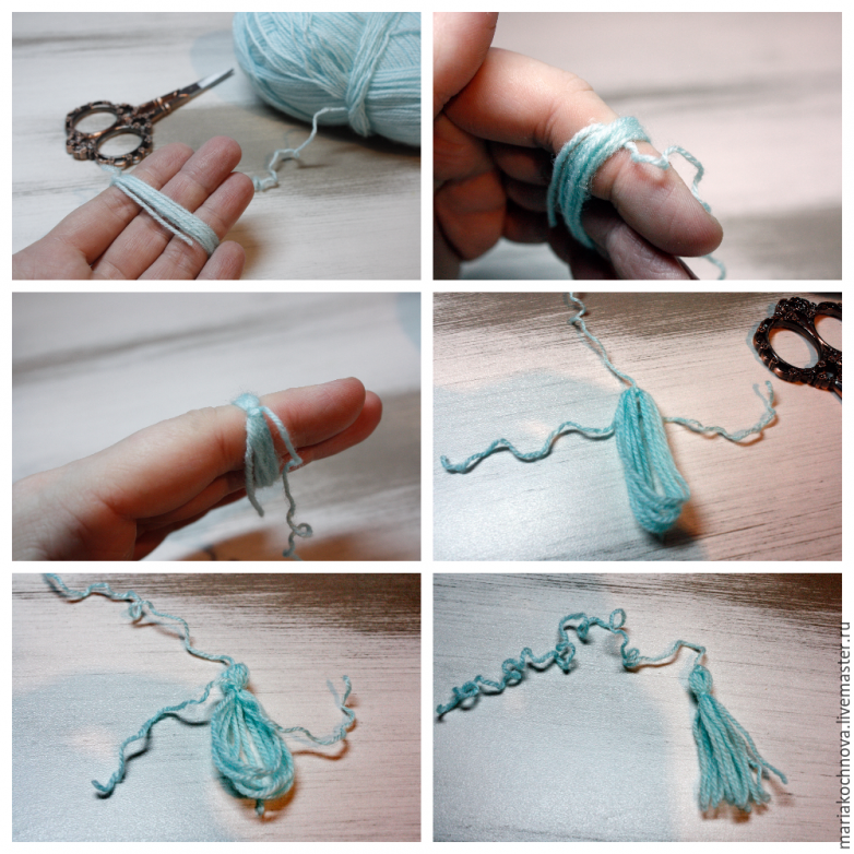 Наматываем на 3 пальца пряжу в 8-12 оборотов. Кончик оставляем побольше, чтобы можно было им завязать пряжу, а также потом привязать к коврику. Подсовываем, как на втором фото, наш кончик, пару раз обматывает пряжу перпендикулярно и завязываем (3 фото). Берем еще одну не очень длинную ниточку и завязываем ее, чтобы получилась шляпка нашей кисточки (4 и 5 фото). Разрезаем ниточки снизу. Готово!