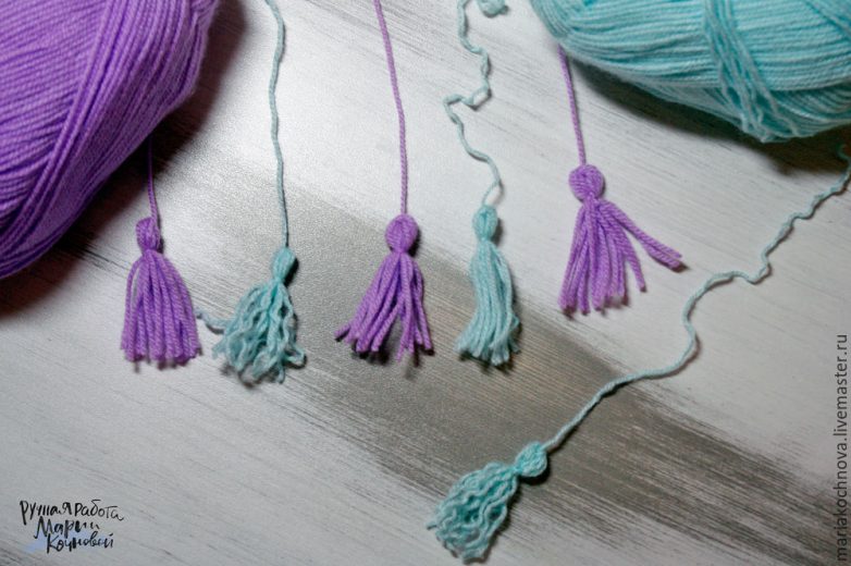 Количество кисточек может быть любым, как вам больше нравится. Я сделала 6 штучек с одной стороны и 6 с другой. Бирюзовые получились кудрявые и смешные, потому что я тут учусь вязать и пряжу использовала для своих начинаний. Кто же знал, что тонкая пряжа не для новичков.
