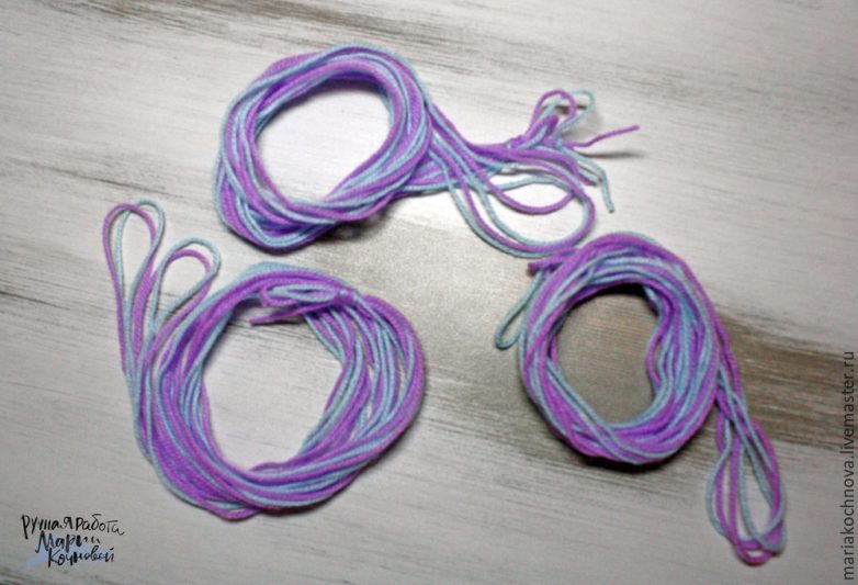 И тут меня понесло! Надо сделать косичку, подумала я, и сделала. Берем нашу пряжу, совмещаем 2 цвета. Где-то метра 3-3,5 отматываем и складываем в 4 слоя. Должна получиться веревочка сантиметров 80 ±. Делаем 3 шутки.