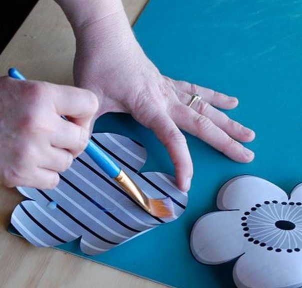 3. Нанесите тонкий слой акрилового лака на обратную сторону бумаги с помощью кисти. Бумажные цветы не должны пропитаться насквозь. Слой должен быть ровным, без избытка клея.