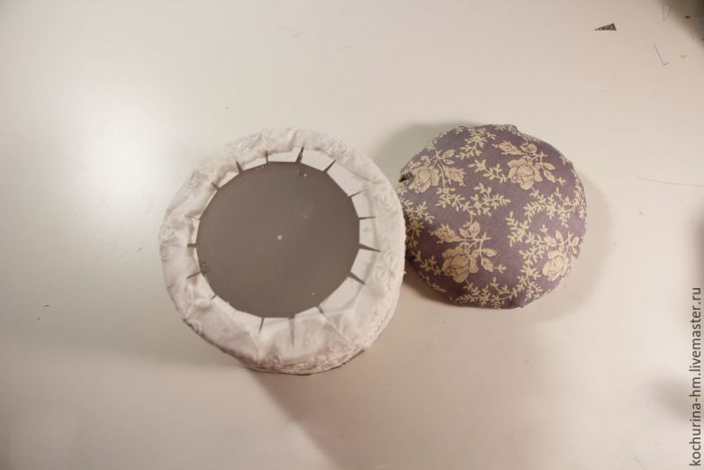 Теперь берем заготовку из пивного картона и вырезаем из ткани круг по размеру этой заготовки + 2-3 см на подгиб.