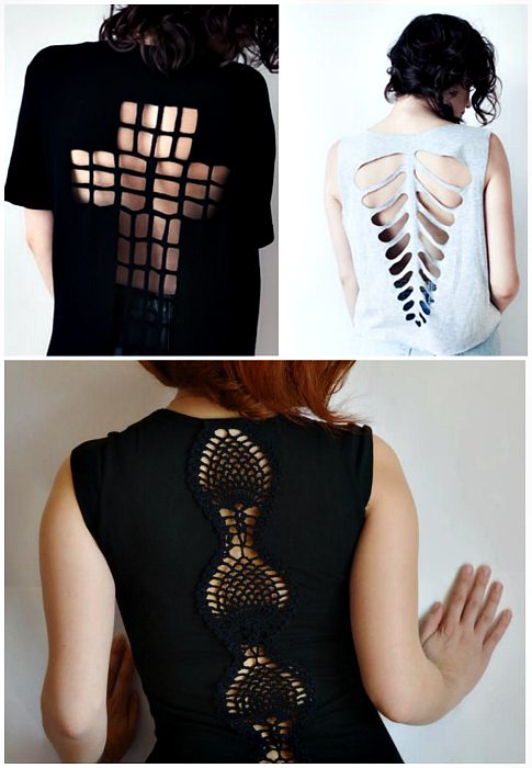 Придать футболке новый модный вид помогут оригинальные разрезы на спине. Для этого, вооружившись мелком нужно наметить схему будущих разрезов и аккуратно вырезать все нужные детали. Готовое изделие следует замочить в горячей воде и оставить высыхать.