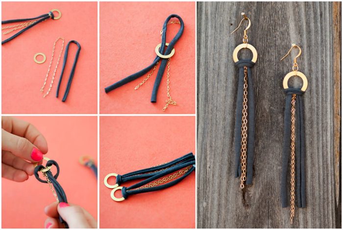 Старую футболку или топ можно использовать для создания стильных длинных сережек. Однако для создания таких украшений помимо футболок понадобится еще и специальная фурнитура, купить которую можно в магазине для рукоделия.