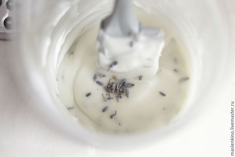 В конце добавляю каплю витамина Е, эфирное масло лаванды и горсточку сухоцветов.