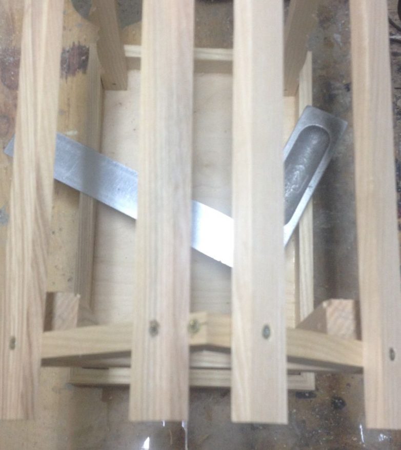 Шесть небольших канавок сделаны для прижжённости. Включаем станок и тонкой рейкой придавливаем к заготовке в прорези до появления чёрных полос.