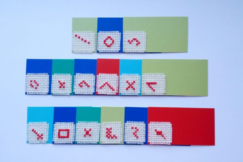 1. На квадратах из канвы делаем небольшие вышивки из нескольких крестиков. Вышивать в данном случае можно всё что в голов придёт — у меня получились такие незамысловатые значки.