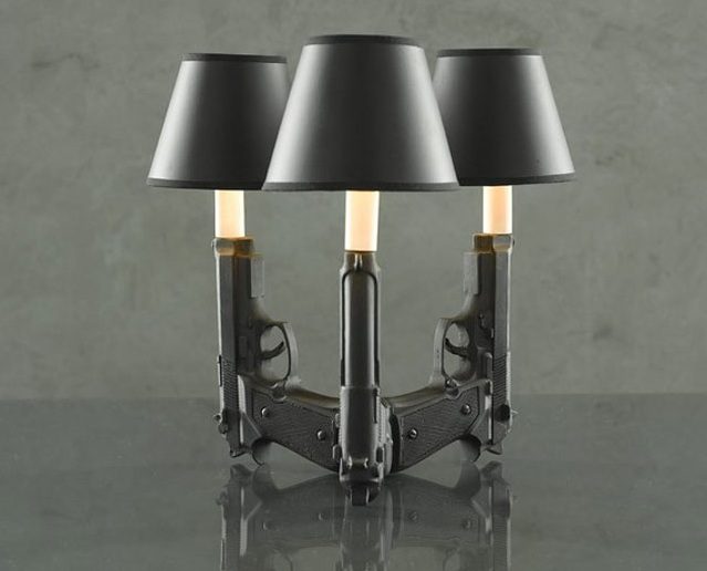 Роль подставки для вполне обычного абажура выполняют реалистичные револьверы. Правда, изготовлены они из керамики, а не из металла.