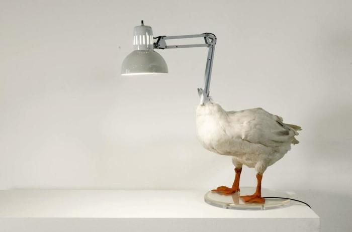 Такой причудливый светильник составлен из чучела гуся и металлического абажура. Такой арт-объект по достоинству оценят любители эпатажа.