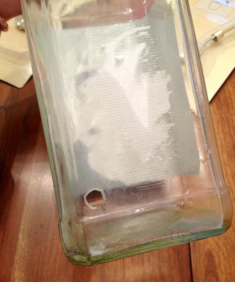 Опустошите и промойте бутылку. С помощью дрели и сверла для стекла аккуратно просверлите отверстие для провода внизу задней стенки. Чтобы избежать раскола, место сверления можно предварительно оклеить прозрачной клейкой лентой.