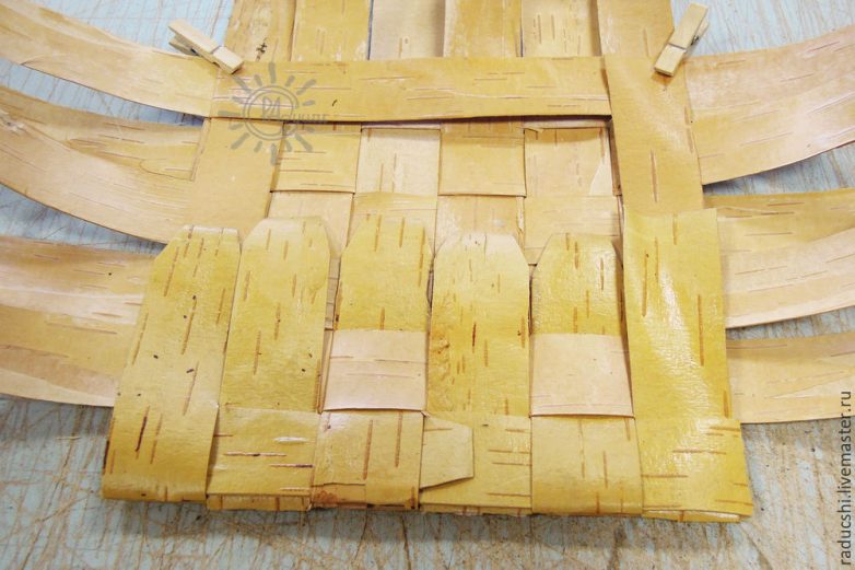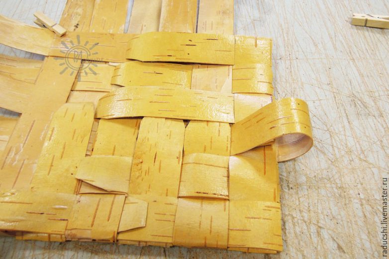 Затем, постепенно, от этого угла начинаем заворачивать и остальные ленты. Причём, те ленты, которые снизу прилегают к столу — сверху будут прятаться под перпендикулярно идущую, таким образом достигается эффект переплетения, а благодаря проложенным по периметру лентам кромка получается плотно сомкнутой.