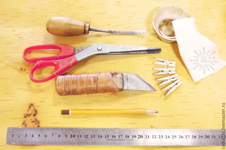 Достаточное количество бересты. У меня это 1 не очень большой лист.Сапожный нож. Заточите поострее.Длинная железная линейка. Можно заменить ровной доской.Ножницы.Простой карандаш.Кочедык (каточек).Бельевые прищепки (тугие скрепки).