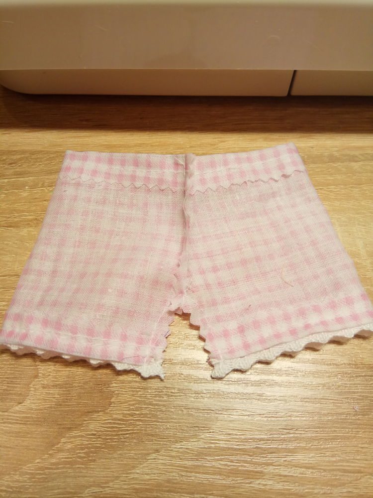 Приступаем к одежде. Выкраиваем панталончики. Берем ткань. Складываем лицом друг к другу. Рисуем нашу выкройку на ткани. Подшиваем сверху и снизу. А затем прошиваем верхние боковые швы. Вот так: