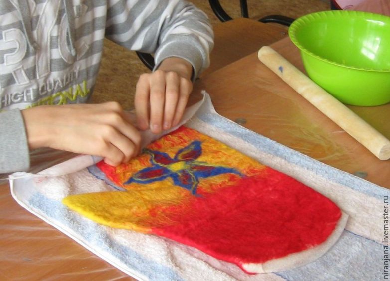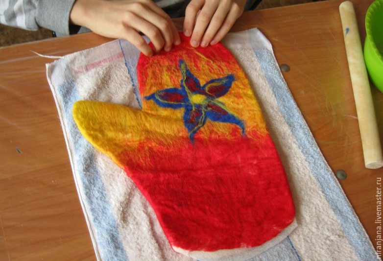 Выкладываем 2 сторону цветной шерстью, смачиваем, накрываем, прокатываем, переворачиваем на 1 сторону, загибаем концы. Просматриваем, есть ли пробелы, закрываем шерстью. Теперь можно выложить шерстью любой простой рисунок, цветочек, например. Обратите внимание, чтобы рисунок был на тыльной стороне той руки, для которой предназначена варежка, чтобы не получилось на ладони.