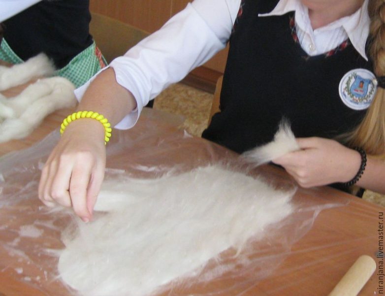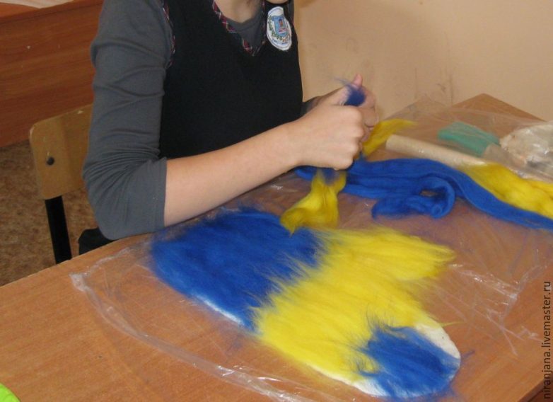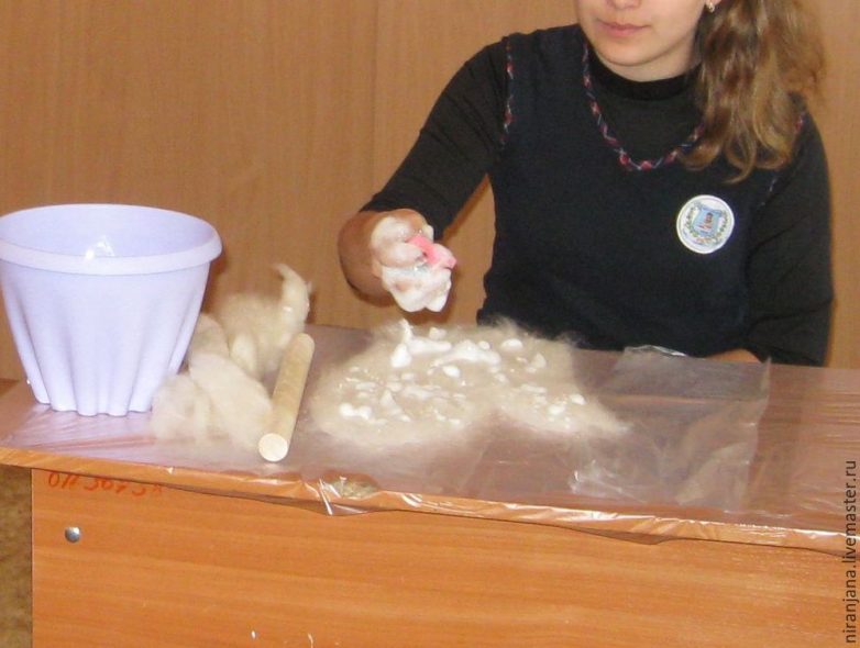 Левой рукой придерживаем, не сильно зажимая шерсть, правой отделяем пасму и укладываем 1 слой вертикально, соблюдая равномерность, смотрим, чтобы не было прорех. Шерсть укладываем рядами. Каждый последующий ряд концами пасмы накрываем предыдущий.