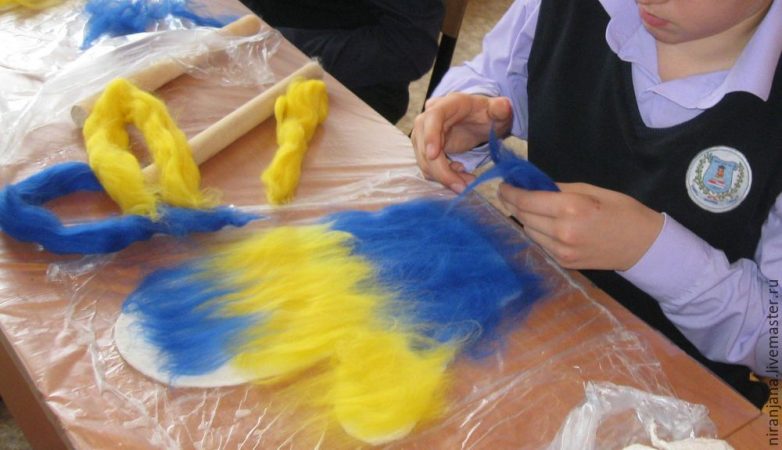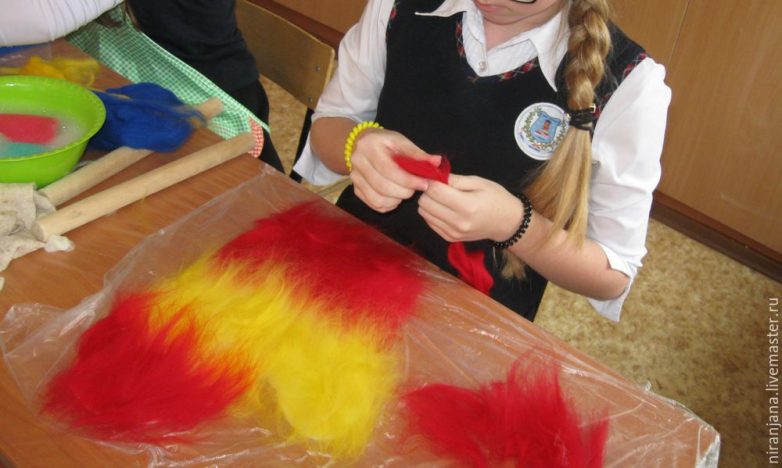 Самобытная, пусть чуть-чуть неровная, но настоящий хэнд мэйд! Давайте пройдемся по этапам. Этот мастер-класс я провела со школьниками, мы потратили в итоге всего 3 часа на всю работу, причем с детьми, которые до этого не держали шерсти в руках. Первое — заготовим шерсть, потребуется на 1 рукавицу 50 гр ориентировочно. Покупаем шерсть для мокрого и сухого валяния лучше тонкую (гребенная лента), обратите внимание, если на упаковке написано только для сухого валяния, то эта шерсть нам не подойдет. Нужна будет еще пупырчатая пленка, которую мы стелим на стол. Также сетка синтетическая, которую можно купить в тканях, либо москитная, которая продается в садоводческих магазинах. Размер как минимум 40 см х 80 см, еще полиэтиленовая пленка тонкая (я покупаю мешки для мусора, разрезаю и пользуюсь), жесткий валик в виде трубки, можно просто черенок распилить длиной 30 см в диаметре от 2,5 до 4 см — самое оптимальное. Полотенце х/б, перчатки, мыльный раствор и выкройка.