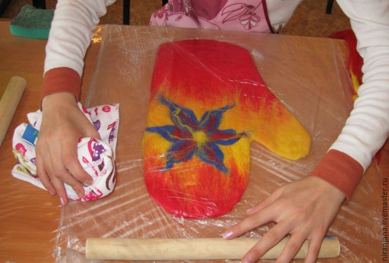Нанесли рисунок, смочили слегка, накрыли пленкой, прокатали, приступаем к следующей операции. Берем в руки махровое полотенце и начинаем тереть всю поверхность варежек, затем трем каждый участок у торцов по окружности варежек, переворачиваем, снова трем, это нужно. Чтобы шерсть начала понемногу сваливаться, и чтобы наш рисунок не пострадал, а закрепился, перед следующим действием. В общей сложности вручную поработали минут 15. Далее можно маленькими ножничками сделать разрез в основании рукавицы. После этого подстилаем сетку, кладем на нее варежку в пленке и на валик плотно накручиваем варежку, начинаем катать, для того чтобы шерсть продолжила сваливаться. Это более грубое воздействие.