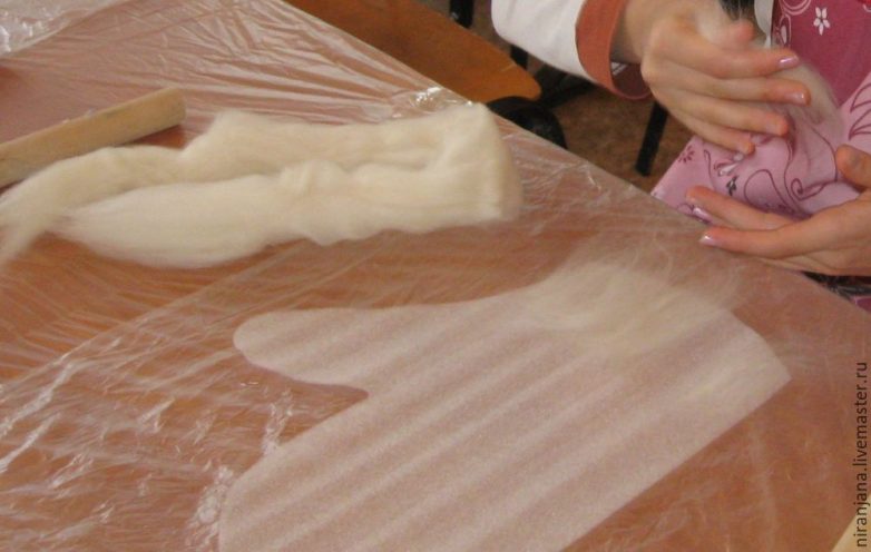 Накрываем пленкой, плотно прикатываем валиком и переворачиваем на другую сторону. Видим концы шерсти по краям, загибаем их на 2 сторону, если они суховаты, то смачиваем, чтобы они как бы приклеились плотно к выкройке. Точно также начинаем вертикально раскладывать шерсть. Повторяем смачивание, накрываем пленкой, прикатываем валиком, переворачиваем на 1 сторону, снова загибаем концы шерсти на эту сторону, шерсть загибаем так, чтобы на торцах выкройки было плотное прилегание.