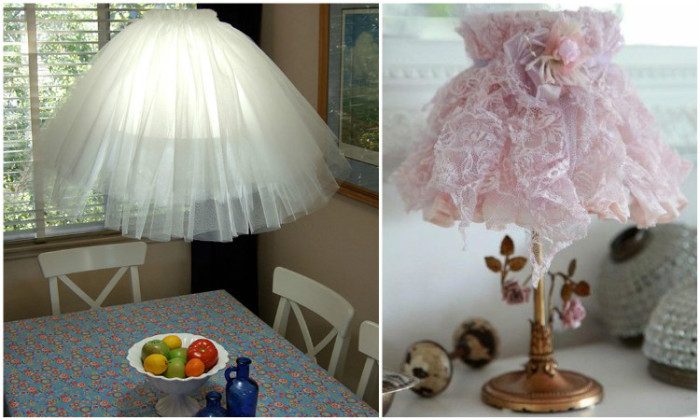 Полупрозрачный текстиль, к примеру, тюль от старых занавесок, может обрести вторую жизнь. Собрав его в верхней части в складки, закрепите на надоевшем абажуре.