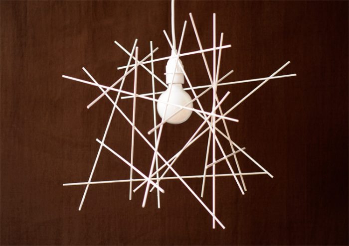 Пара вечеринок — и материал для светильника своими руками собран.Светильник из коктейльных трубочек выглядит демократично, но при этом эффектно. Прото приклейте трубочки одной из сторон на старый абажур при помощи силиконового клея. Если разрезать трубочки напополам, то светильник получится меньшего размера.