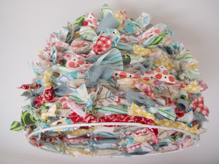 Множество разноцветных лоскутков завязываются на основе от старого абажура. Чем их больше – тем лучше.