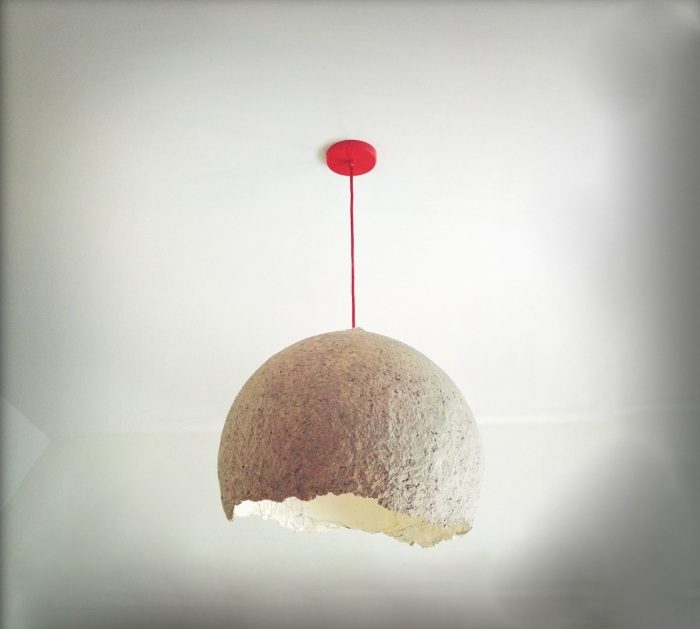 Светильник в технике папье-маше.Для изготовления оригинального светильника своими руками придется вспомнить технику папье-маше, знакомую всем с детства. Бумагу нужно разорвать на мелкие кусочки и оставить на пару часов в водном растворе ПВА. Затем бумажной массой слой за слоем обкладывается предмет нужной формы – например, надутый воздушный шар. После высыхания папье-маше абажур готов.