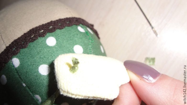 Вот, теперь мы уже болтаемся, осталось дело за малым. Украсить и добавить части тела. Пришиваем кружево на стыке тканей, если раньше у вас получались неровности — последний шанс их скрыть :)