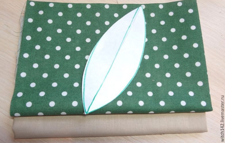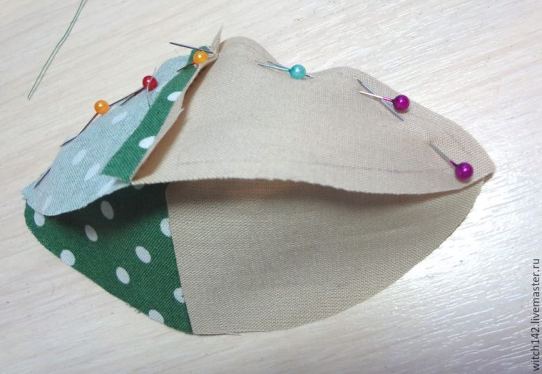 Складываем два лепестка лицевой стороной внутрь. Сшиваем по одному краю (сшивать лучше нитками разного цвета, верх — телесный, низ — зеленый. С перекрытием по центральному шву). Пришиваем последовательно каждый лепесток.