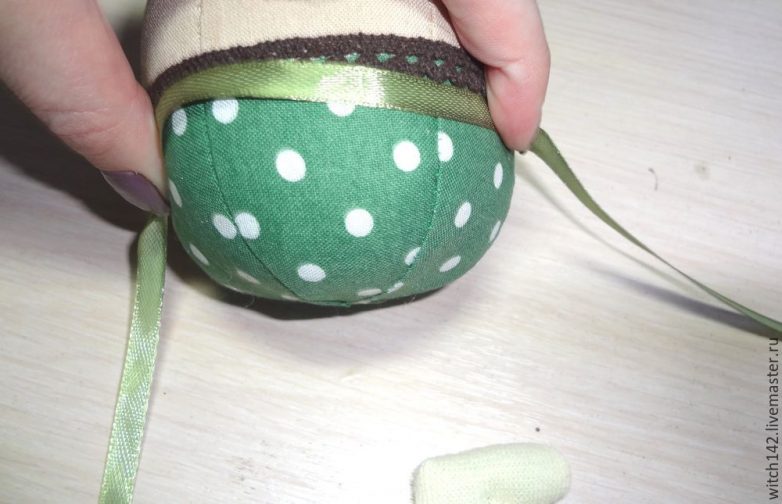 Последний шаг — осталось прикрепить все к туловищу. Для этого отмеряем на глазок необходимое количество ленты — ручки/ножки должны болтаться.