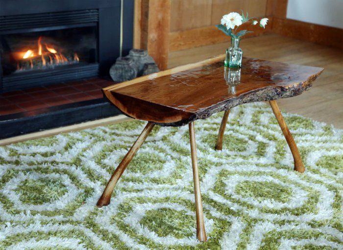 Особенно оригинально, но вместе с тем роскошно, выглядит журнальный столик на асимметричных ножках. Столешница изготавливается из толстой доски или деревянного спила.