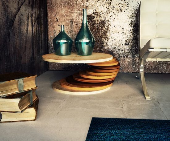 Журнальный стол из плоских элементов, скрепленных между собой в хаотичном порядке – идея, которую легко реализовать. Подойдут деревянные спилы, части досок, большие книги.