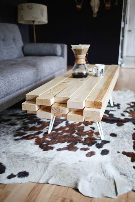 Деревянный брус, сложенный в шахматном порядке, станет столешницей для самодельного журнального столика. Ножки можно изготовить из толстой металлической проволоки.