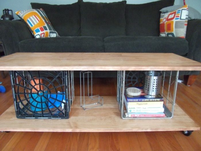 Функциональный стол из коробки.Хозяйственная коробка из пластика или дерева также может использоваться в качестве журнального столика. Для того чтобы столик был мобильным, можно закрепить на ее дне небольшие колеса.