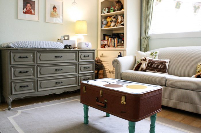 Старый чемодан может стать оригинальной столешницей для журнального столика. Необходимо лишь приделать к нему ножки.