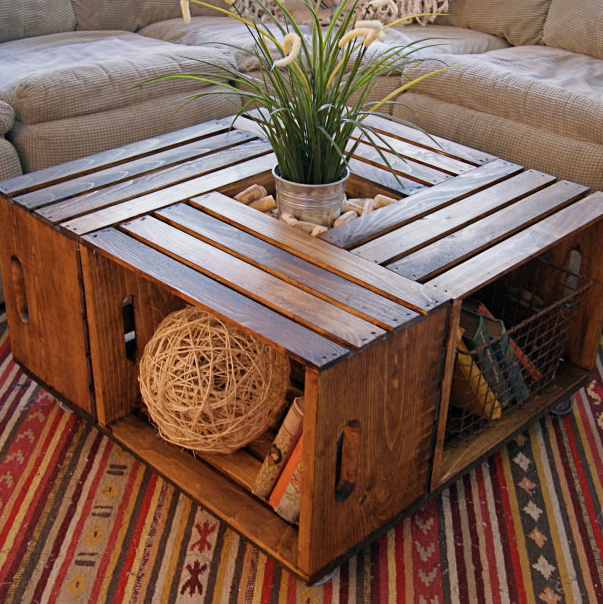 Еще один способ стать обладателем журнального стола из натурального дерева – это использовать в качестве материала для его изготовления старые ящики. Четыре больших ящика, скрепленных вместе, образуют стильный стол.