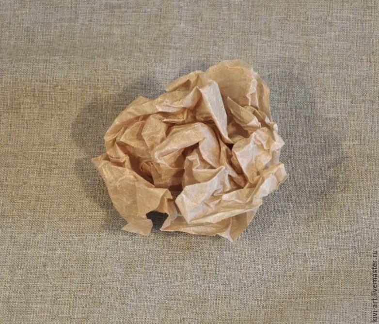 Началась работа с крафт-бумаги. Её я смяла в комок, а потом расправила. На бумаге остались неровности и заломы.