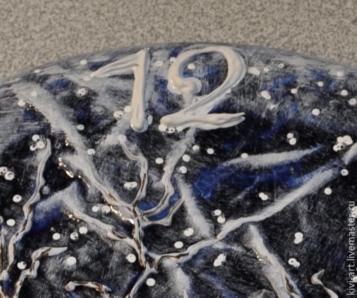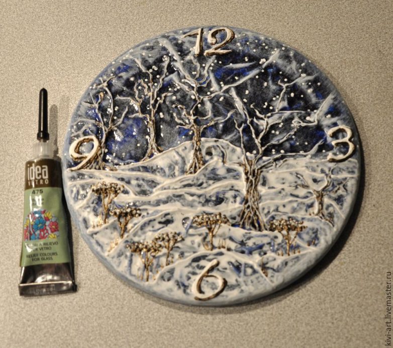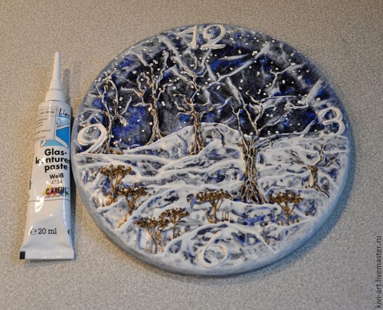 Окрасила стрелки я контурной пастой. Во-первых, потому, что у неё лучшее сцепление с поверхностью, а, во-вторых, для того, чтобы цвет на самой работе точно совпал с цветом стрелок.