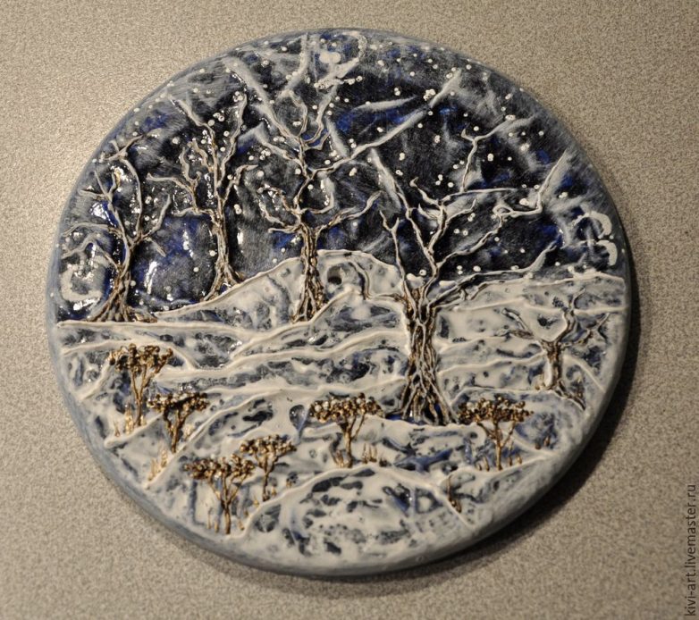 Когда контур подсох, нижнюю часть заготовки — снежные «барханы» я покрыла белой краской для стекла.Так как краска у меня была довольно жидкая, она очень красиво растеклась по нанесённой ранее синей краске.