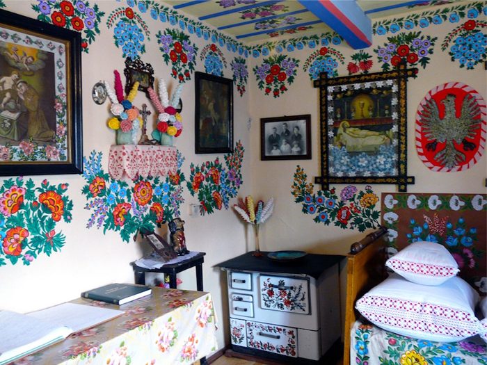 Так как же началась эта традиция в Залипье (Zalipie). На самом деле, достоверных фактов не существует, однако самая достоверная версия гласит, что местные женщины стали расписывать свои дома изнутри из-за плохой вентиляции дома, когда сажа от печей оседала на потолках и стенах. Такие пятна выглядели неопрятно даже если их отмыть, и чтобы закрасить подобные изъяны, женщины рисовали самые простые рисунки – цветы.
